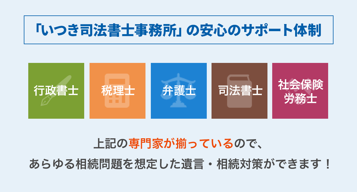 いつき司法書士事務所は吉祥寺・新宿・世田谷区、杉並区、練馬区、調布市、西東京エリアの遺言書作成・相続相談を中心に、累計20,000件以上の遺言書作成・相続・法律相談を実施している遺言書・相続対策の専門家です。